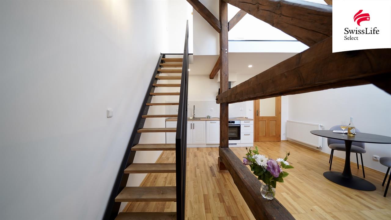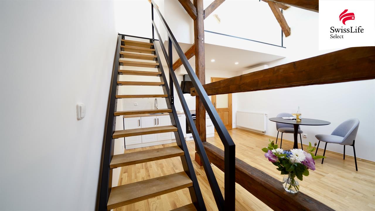 Stylové dřevěné trámy dodávající bytu jedinečný charakter.