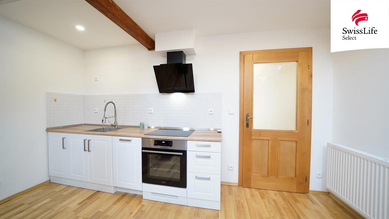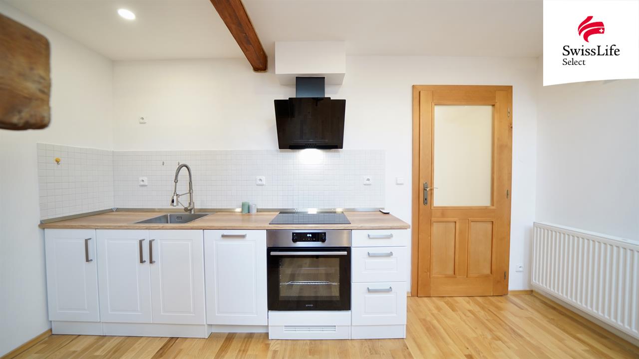 Prostorný obývací pokoj s kuchyňským koutem vybaveným novou linkou se všemi požadovanými spotřebiči.