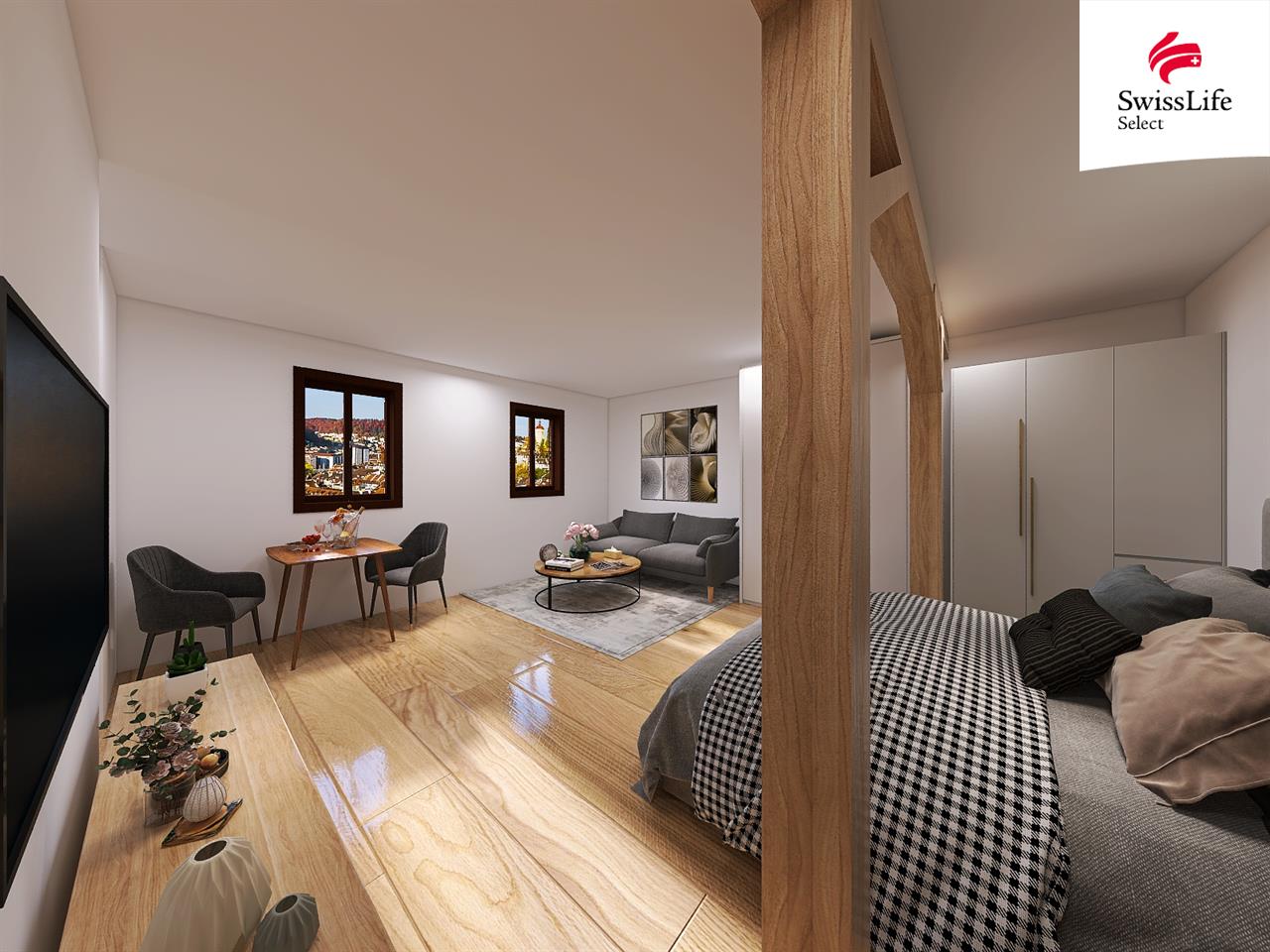 Byt je čistě vymalovaný a kompletně vyklizený, koupelna i kuchyň byly rekonstruovány před 13 lety, ale vše je plně funkční. Střešní okna jsou relativně nízko, výhled tedy není jen do nebe a zvláště v letních měsících oceníte, že jsou orientována na východní stranu. Pro představu o možném rozložení prostoru pokoje přikládáme vizualizaci včetně vybavení.