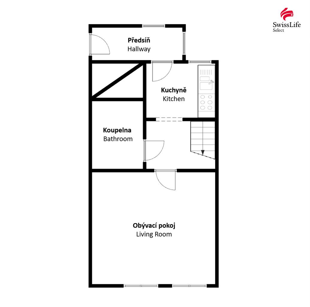 Kuchyňská linka obsahuje vestavěné spotřebiče. Prostor pod schody do patra na spaní nabízí spoustu úložného prostoru. Vysoké stropy (3 - 3,2 m) zajišťují světlost a vzdušnost.