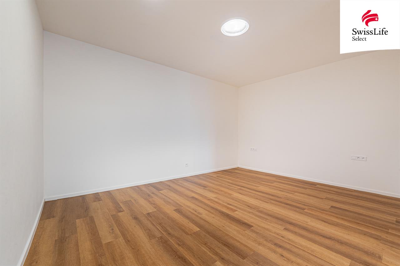 Dispozice: vstupní chodba, koupelna s WC, prostorný pokoj s kuchyňským koutem a vstupem na balkon. Příslušenství bytu tvoří sklep 3,4 m².