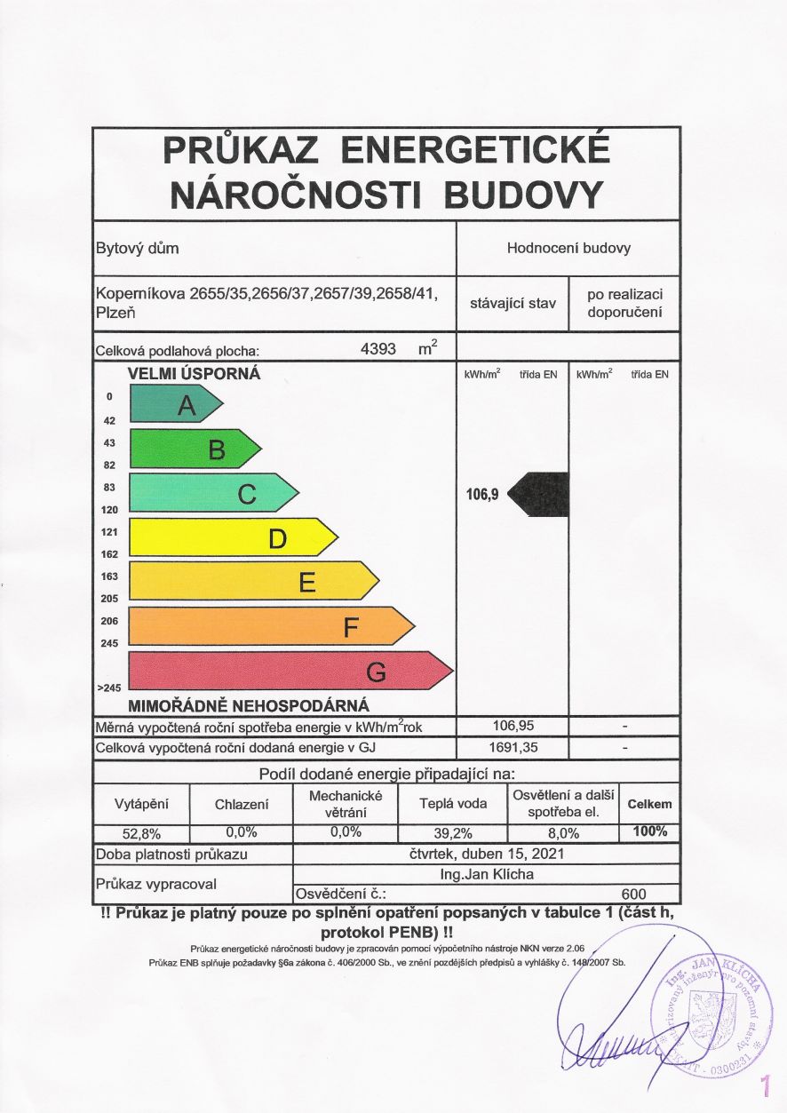 | Ukazatel energetické náročnosti budovy | 107 kWh/m2.rok |