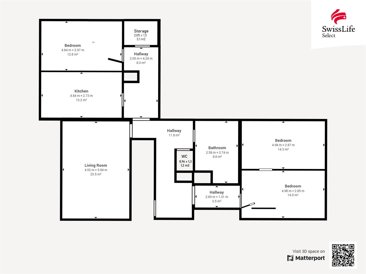 Bezvadná dispozice bytu poskytuje velkorysou předsíň s možností mnohých úložných prostor, a ta byt dělí na dvě části. Jedna část má výhledy na západ a nachází se zde 3 místnosti: prostorný obývací pokoj, kuchyň s jídelním koutem a samostatná ložnice. Ve východní části jsou pak další dva pokoje/ložnice, přičemž jeden je průchozí. Byt disponuje dvěma toaletami – jedna samostatná a jedna v rámci koupelny, kde je dále jak vana, tak sprchový kout. A jako velký bonus je přímo v bytě také objemná komora, přes 3 m2.