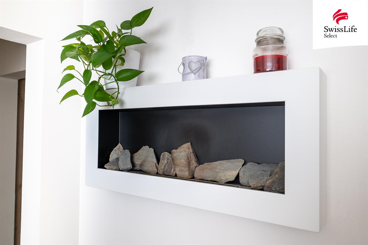 V obývacím pokoji Vás zaujme netradiční designový prvek – dekorativní břízy, které vytváří útulnou a jedinečnou atmosféru. V zimních měsících si navíc můžete užívat teplo a zpříjemnit večery u bio krbu, který nejen krásně vyhřeje obývací pokoj, ale také přidává na pohodlí.