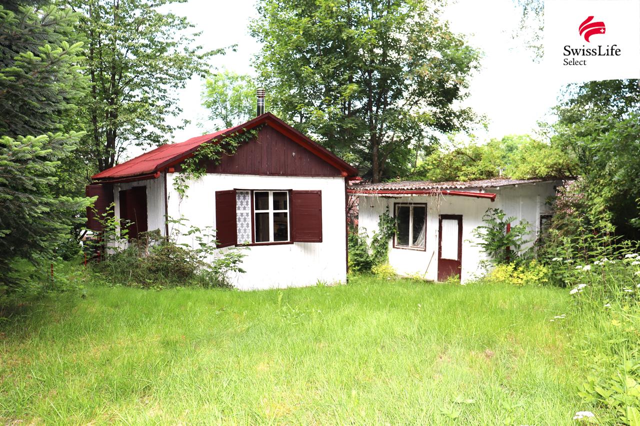 Na pozemku je chata o zastavěné ploše 27 m². Vejdeme do první místnosti, kde je příjemné místo na stolování a výhled do zahrady. Navazující další místnost je ložnice, s výlezem na malou půdu.