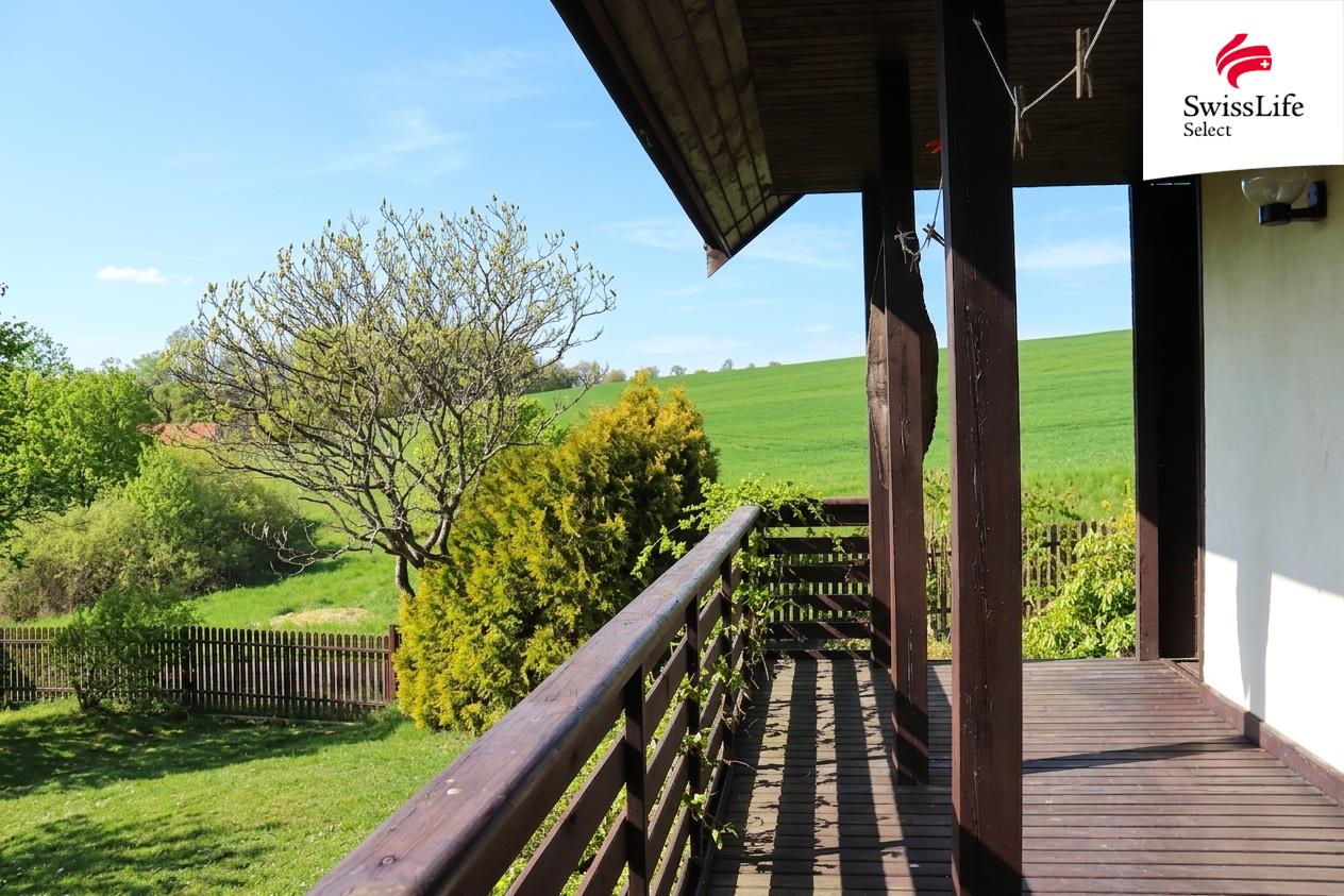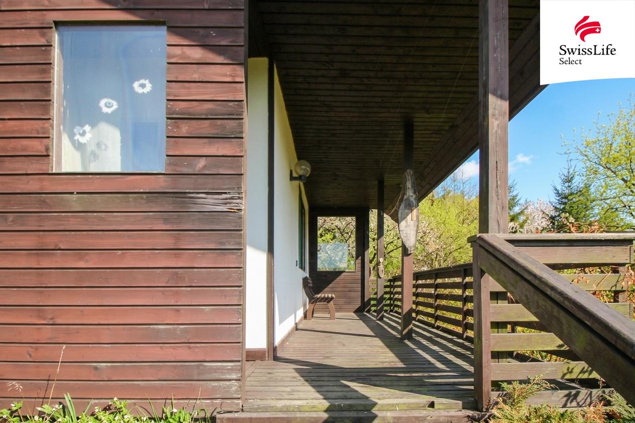 Exteriér: Z chaty vedou dveře na venkovní terasu s krásným výhledem do okolní krajiny. Na chatu navazuje dřevěná přístavba, která slouží jako praktický sklad. Na pozemku je studna.