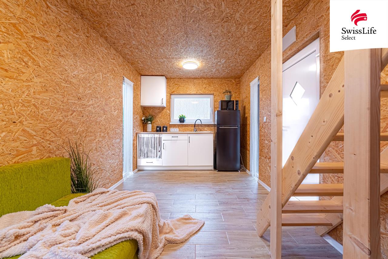 Užitná plocha chaty je 33 m2. Jedná se o dřevostavbu, jejíž výstavba byla dokončena v letošním roce (2025). Chata je patrová, přičemž nahoře je prostor řešen pro spaní. Celý objekt je kompletně zateplený, a to včetně střechy a podlah.