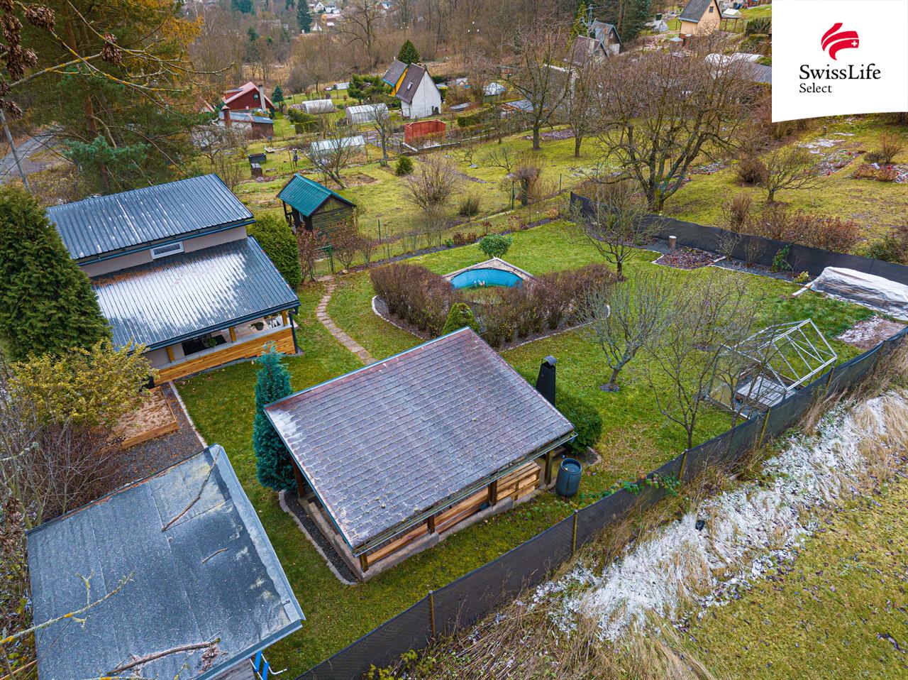 Pozemek je velký 519 m2, je mírně svažitý, a celodenně slunný. Nachází se zde dřevěná pergola s grilem, nadzemní bazén, kůlna, skleník či pískoviště pro děti.