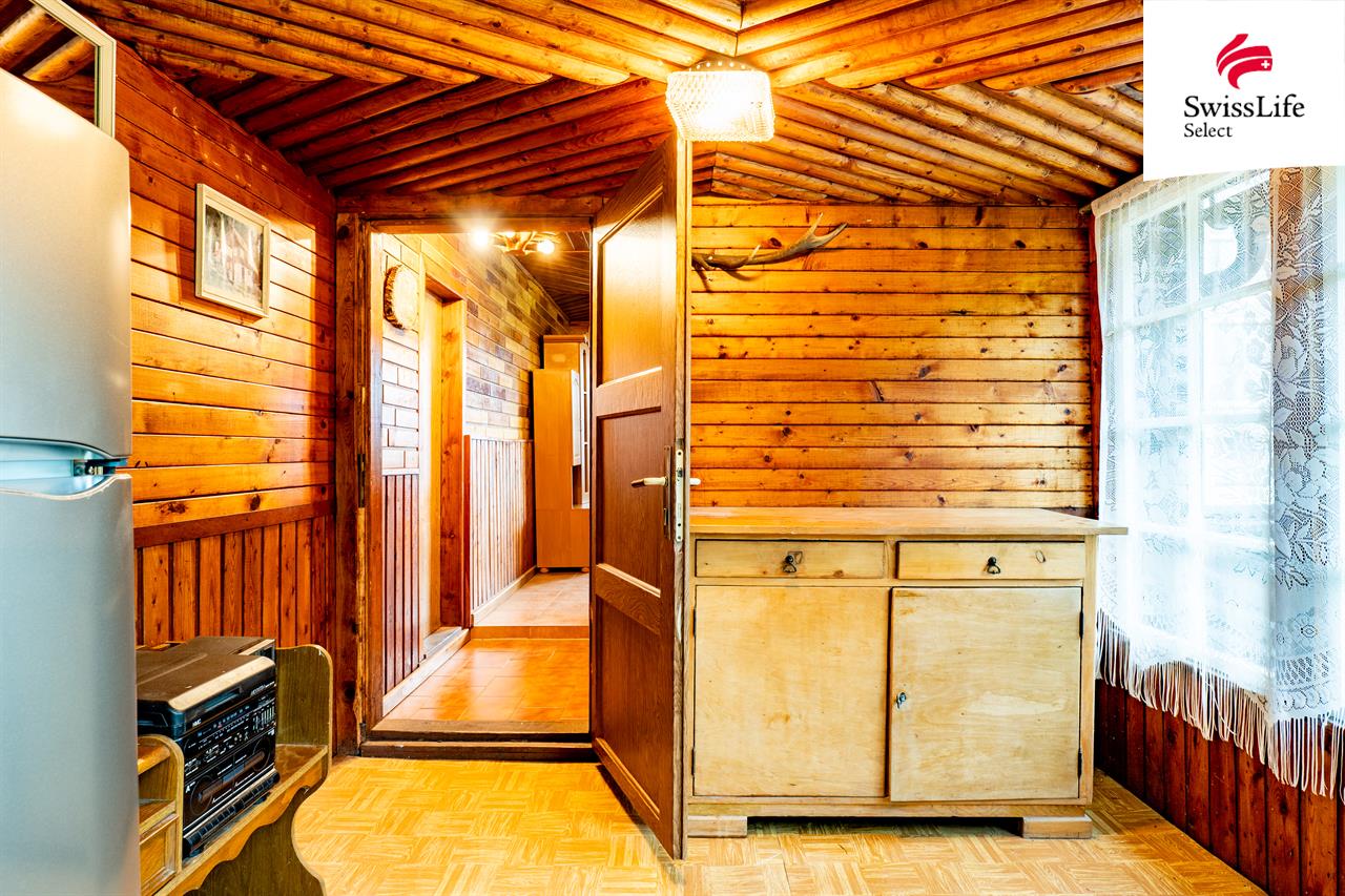 Dispozice nemovitosti: vstupní předsíň, kde si můžete odložit obuv a věci, kuchyňský kout s jídelním koutem, který je propojen s obytným prostorem. Obývací pokoj s krbovými kamny, jež vytvářejí příjemnou atmosféru a současně zajišťují teplo v podzimních či zimních měsících. V přízemí chaty je umístěna také splachovací toaleta.