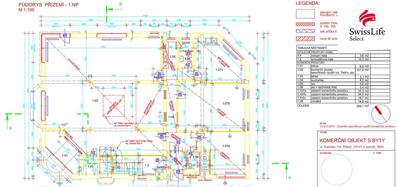 V této původní budově byla započata rekonstrukce, kdy v přízemí objektu je velký nebytový prostor s celkovou podlahovou plochou 259 m. Tento prostor v přílzemí se dá rozděllit i na dva samostatné komerční objekty jako například samostatná prodejna a samostatné kanceláře. Vše viz půdorys přízemí ve fotodokumentaci zakázky.