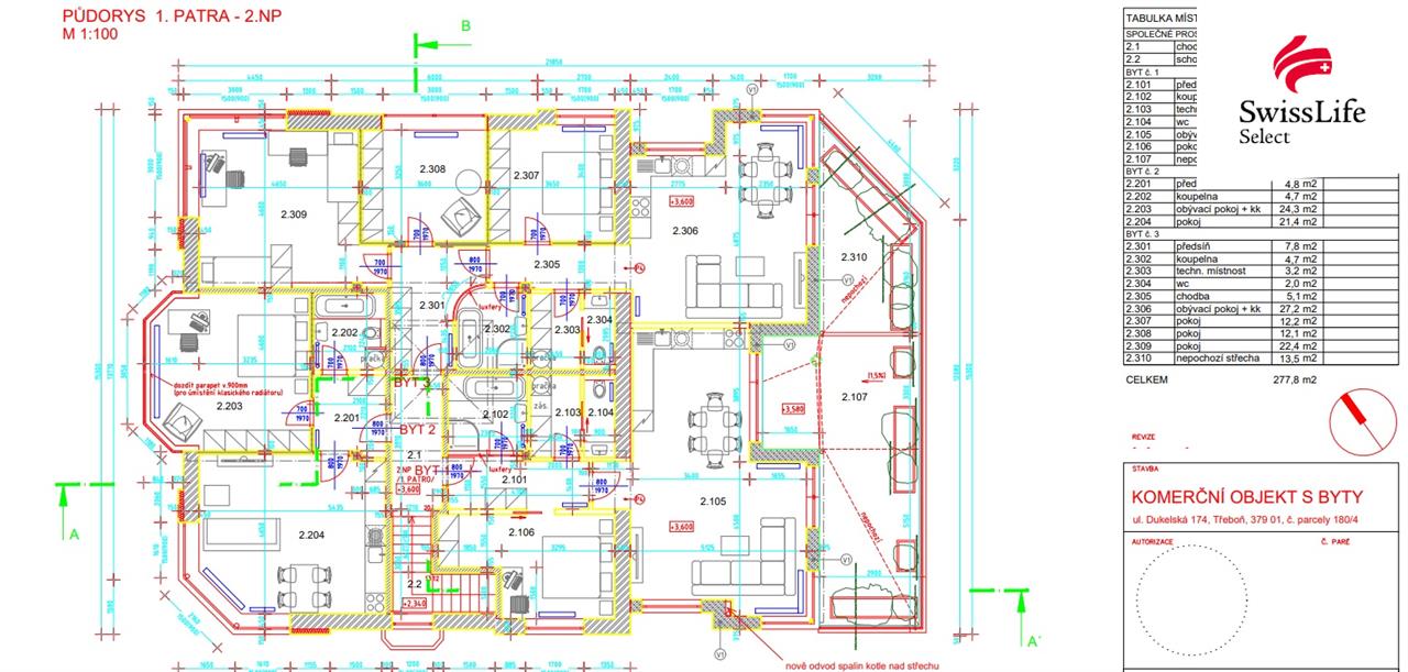 V patře jsou před dokončením 3 samostatné bytové jednotky o velikost 1+1, 4+kk a 2+kk. Dva z těchto bytů mají i terasu s krásným výhledem do okolní krajiny. Půdorys bytů a celého patra je k dispozici ve fotodokumentaci zakázky.