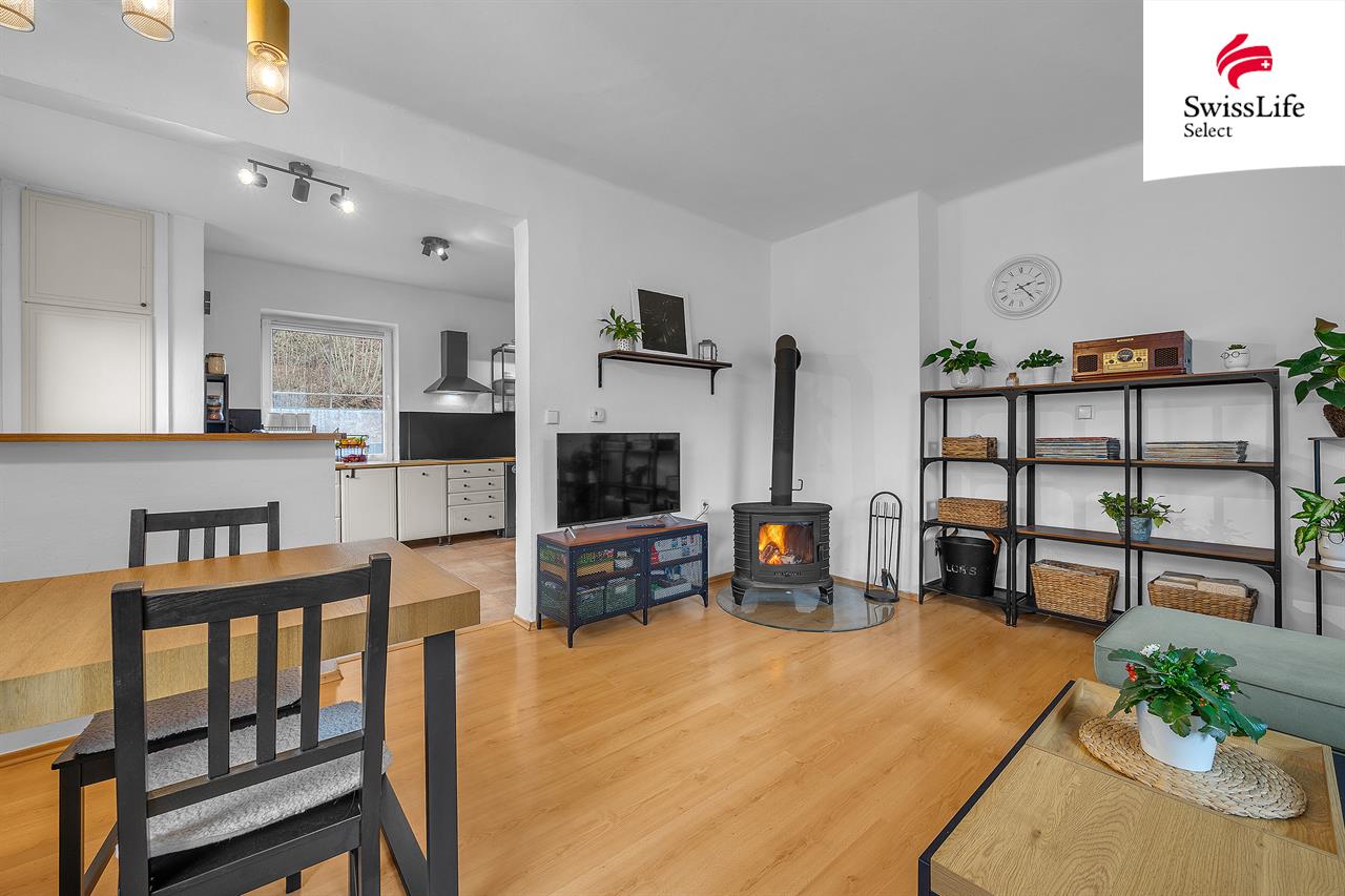 - obývací pokoj s kuchyní a krbovými kamny