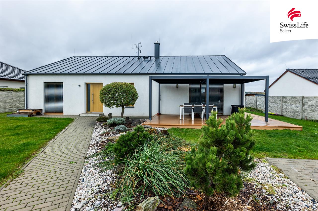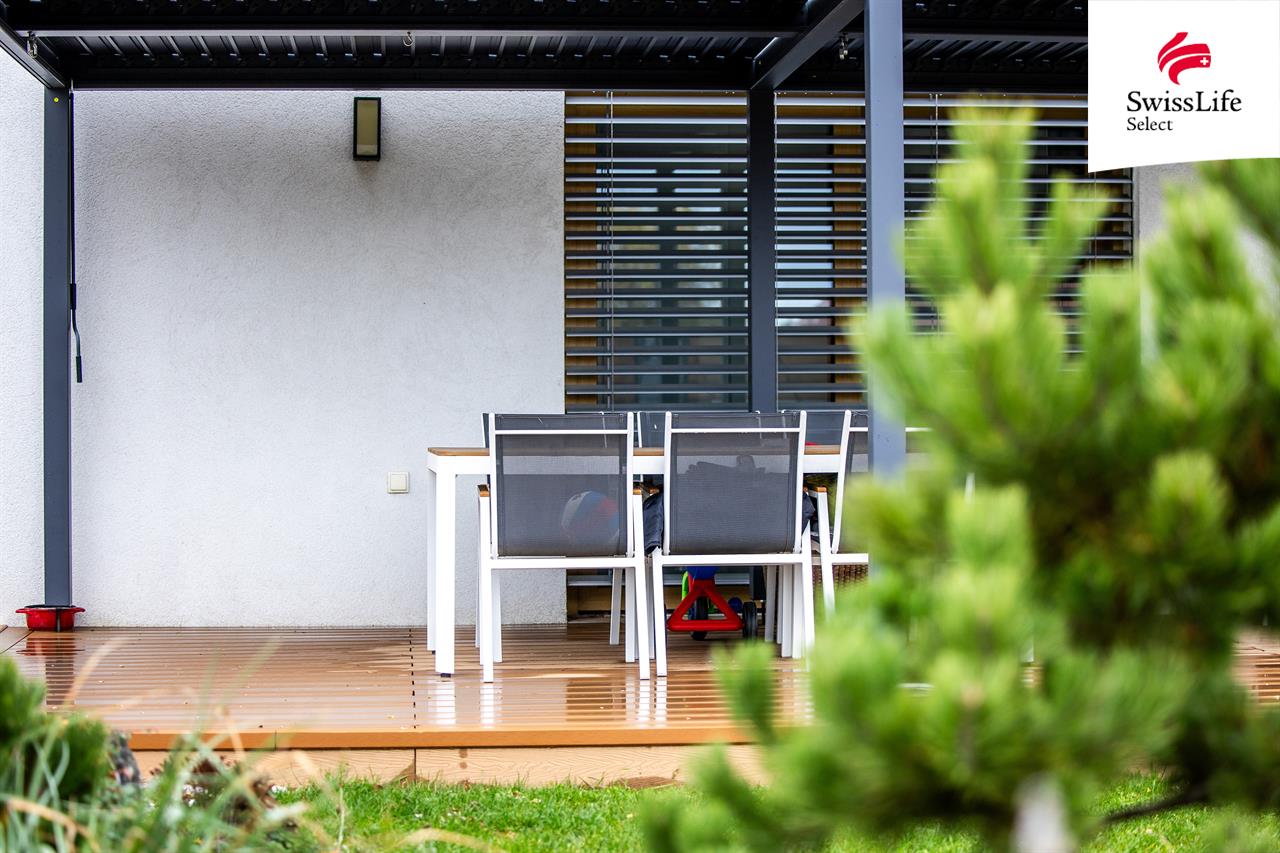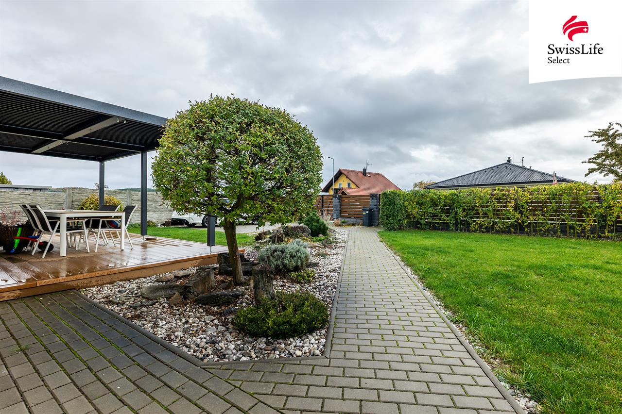 Exteriér tvoří WPC terasa 40 m² s hliníkovou bioklimatickou pergolou, hotové terénní úpravy, chodníky a parkovací stání pro 2 auta. Na pozemku jsou dva zahradní domky a betonový plot (70 m) doplněný okrasným plotem z tvarovek a sibiřského modřínu.