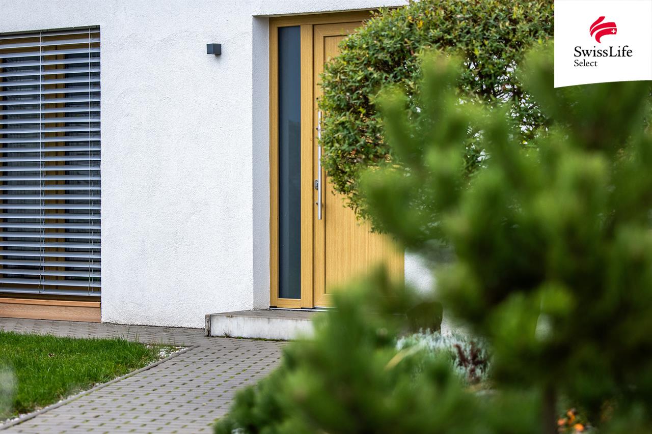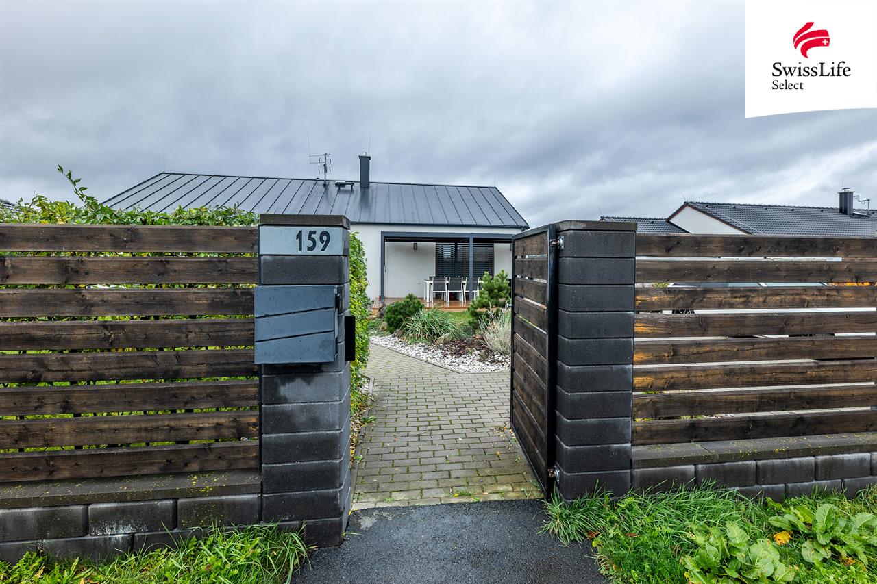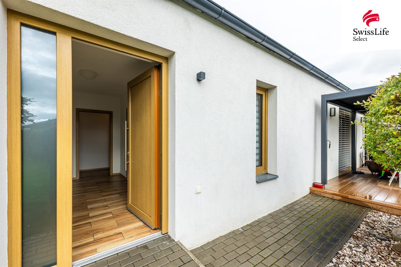 Exteriér tvoří WPC terasa 40 m² s hliníkovou bioklimatickou pergolou, hotové terénní úpravy, chodníky a parkovací stání pro 2 auta. Na pozemku jsou dva zahradní domky a betonový plot (70 m) doplněný okrasným plotem z tvarovek a sibiřského modřínu.