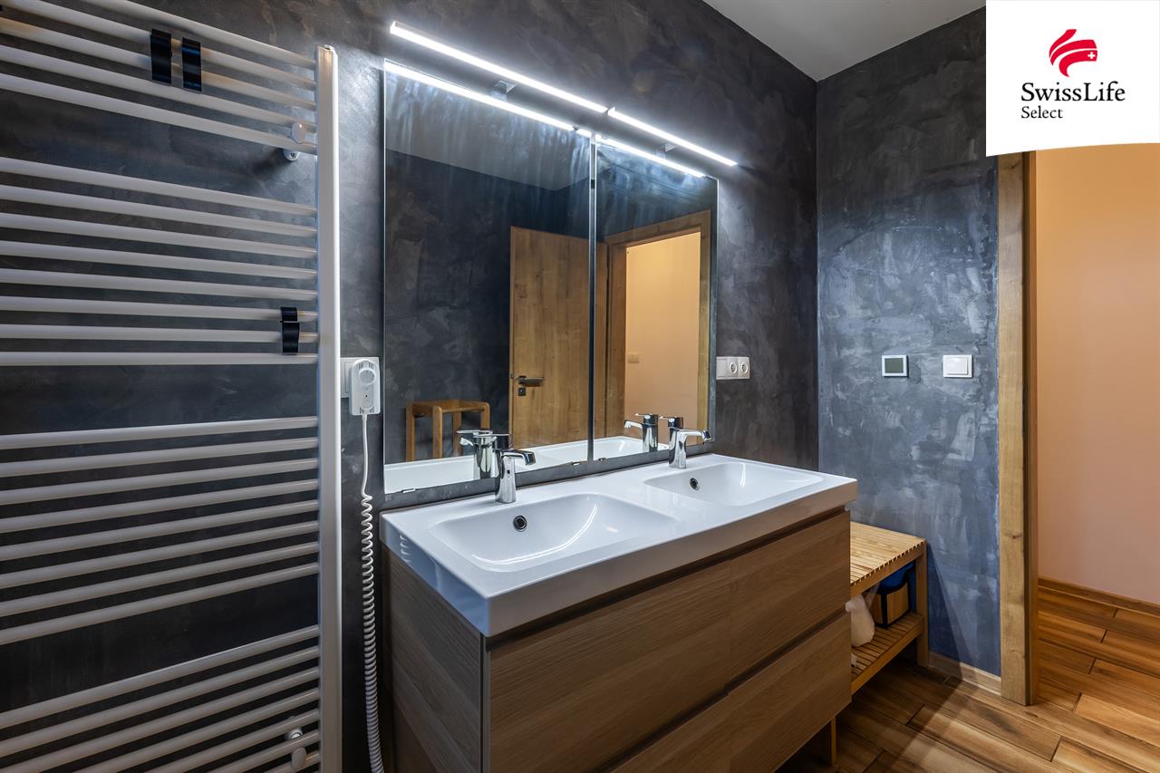 Dům disponuje elektrickým podlahovým vytápěním s termostaty v každé místnosti, nízkoenergetickým krbem (prémiová česká značka, 90 000 Kč) a spadá do energetické třídy B – velmi úsporný provoz, náklady cca 4 500 Kč/měs. Voda je z vlastního 50 m hlubokého vrtu, kanalizace je veřejná. Dům se prodává kompletně zařízený, s dvěma koupelnami (větší s vanou, menší technická, obě se záchodem).