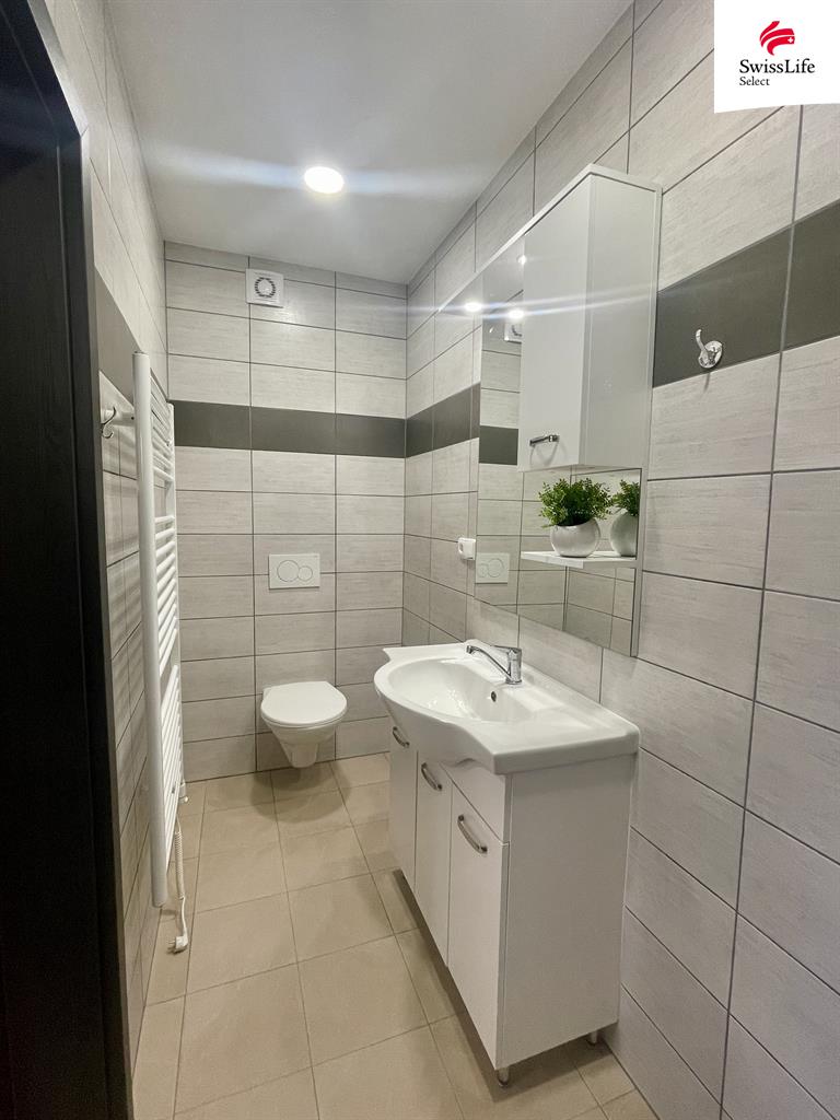 Vedle kuchyně je atraktivní koupelna s velkorysým sprchovým koutem a toaletou. Vše je příjemně barevné, nové a komfortní.