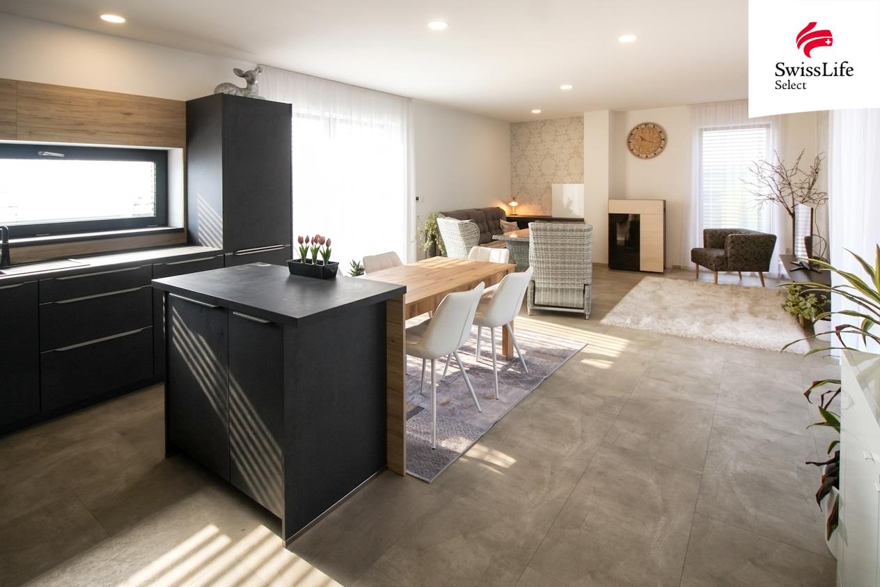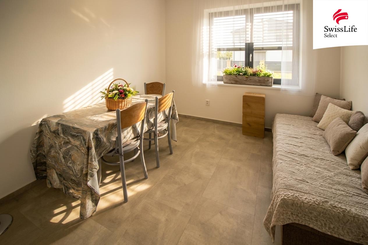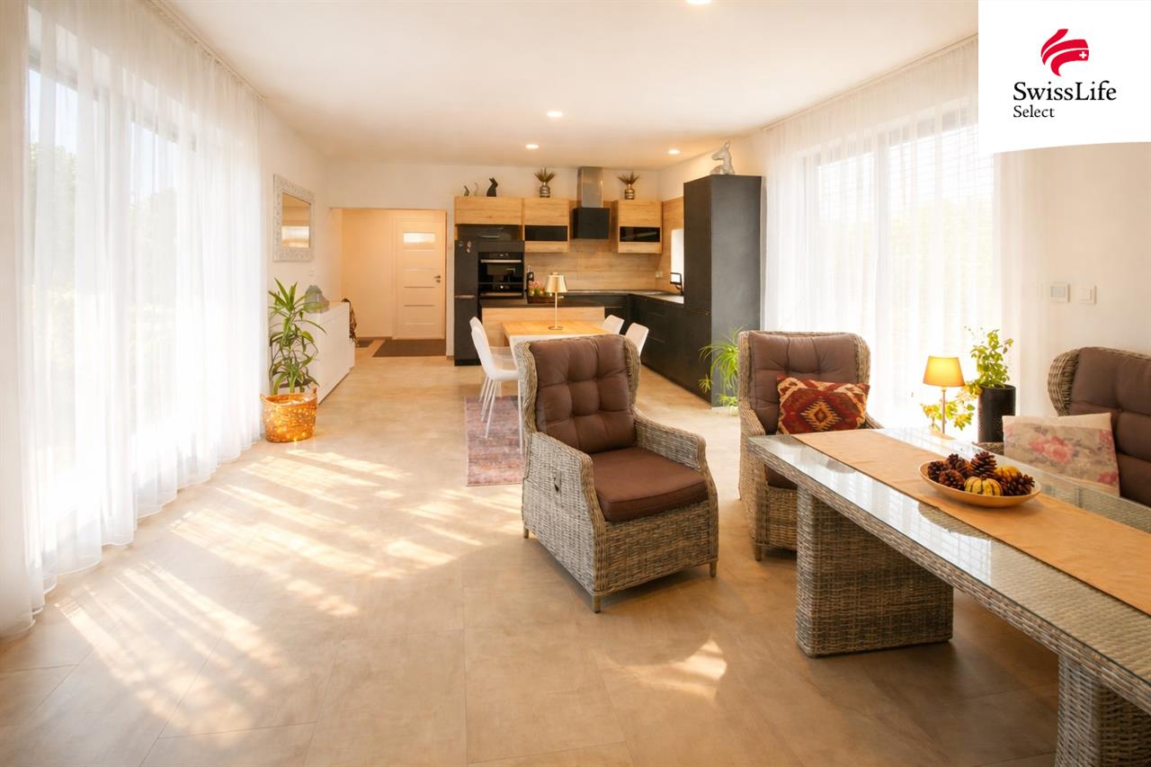 Tento dům byl navržen s důrazem na pohodlí, prostor a harmonii s okolím. Srdcem domu je slunný obývací pokoj s kuchyňským koutem, odkud se přímo vstupuje na prostornou terasu s přípravou na vířivku – ideální místo pro letní večery, rodinné oslavy nebo klidné chvíle jen pro vás. Díky orientaci od jihu na západ je interiér po celý den zalitý přirozeným světlem.