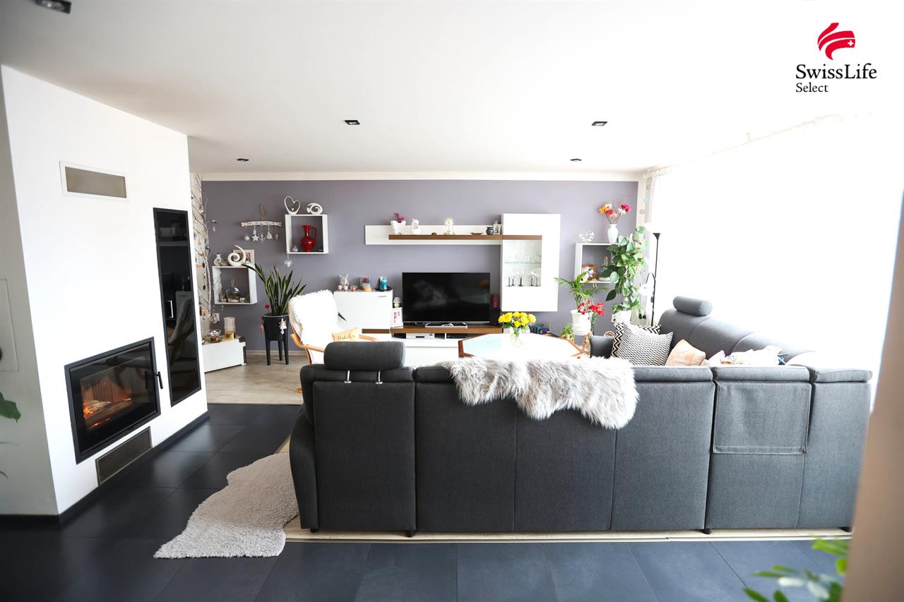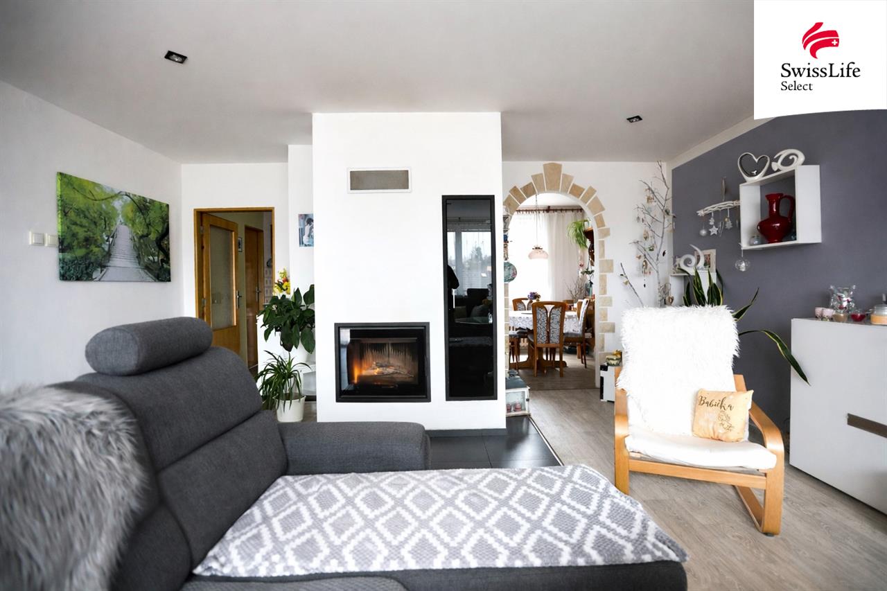 Mezonetový byt (95 m²) – světlý a prostorný interiér s dominantním krbem, který dokáže vytopit téměř celý byt.