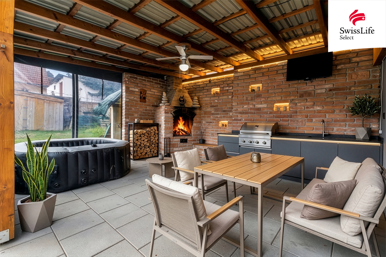 Pokud zatoužíte po čerstvém vzduchu, přesunete se na terasu. Večer se za jakéhokoli počasí můžete schovat pod krytou pergolou, kde je venkovní krb, vířivka a posezení. Ale to není všechno. Naleznete tu i prostornou dílnu pro kutily, venkovní kuchyň a dokonce i sklep, který by mohl posloužit nejen jako sladovací prostor, ale klidně jako menší domácí wellnes se saunou.