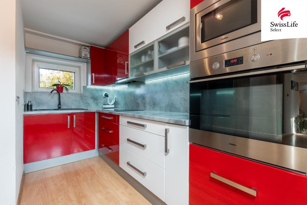 Moderní kuchyně se dvěma okny a prostorným výklenkem pro americkou lednici