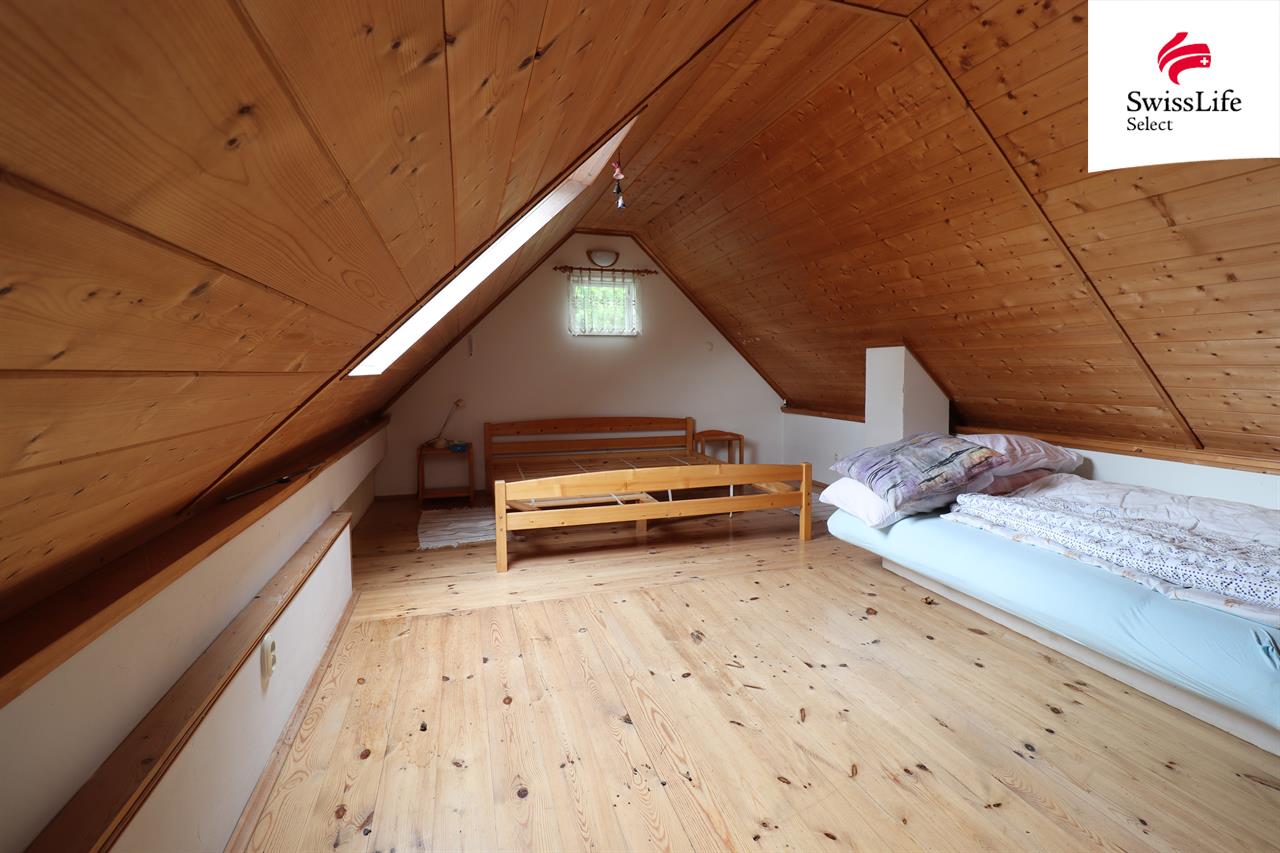 Podkroví domu poskytuje příjemnou atmosféru díky dřevěnému obložení a šikmým stropům.