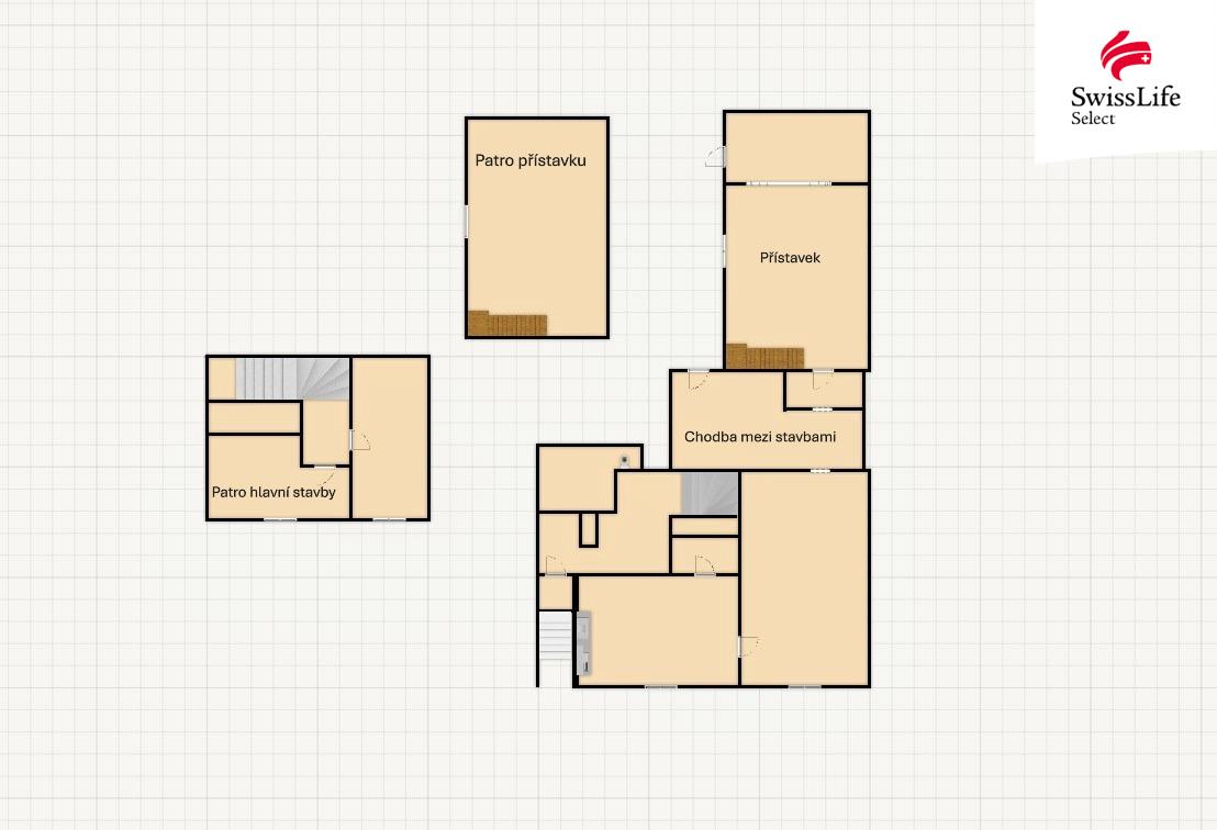 Dispozice: 5 pokojů + kuchyň + koupelna (v hlavním domě)
