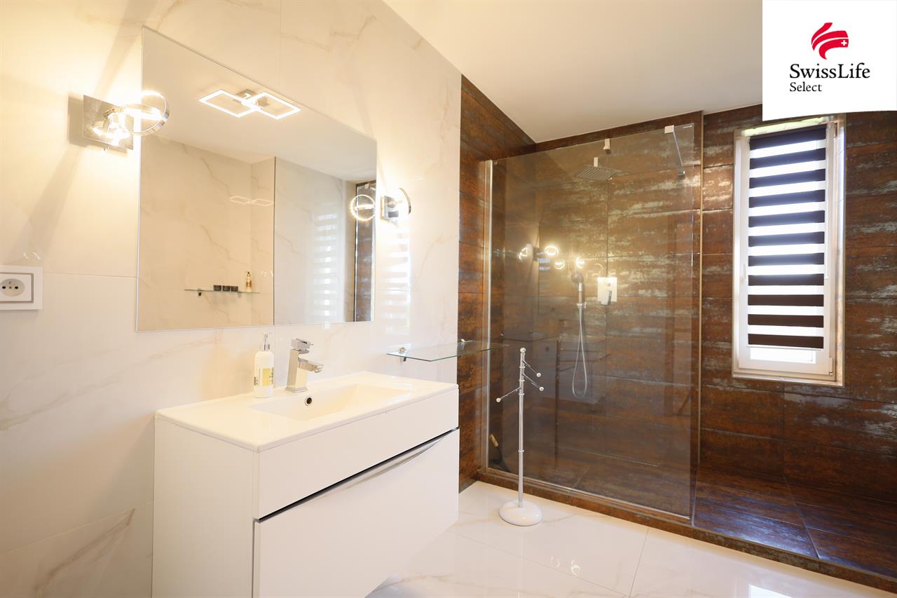 V přízemí jen kousek od vchodových dveří Vás překvapí rozlehlost vstupní haly, s velkou šatní skříní. Menší obývací pokoj naznačuje, že centrum domu přenechává moderní kuchyni s jídelnou a vstupem na krytou terasu s bazénem.