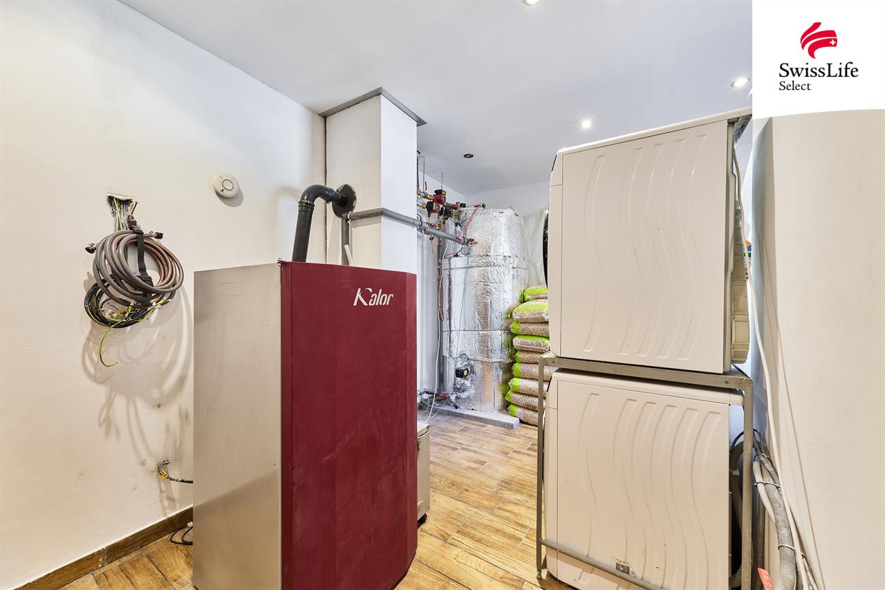 Vytápění zajišťuje kotel na pelety s rozvodem do podlahového topení, dále je příprava na elektro kotel. Ohřev vody el. bojler. Dům je napojen na veřejný vodovod a odpadní vody jsou svedeny do čističky odpadních vod. Na pozemku se nachází retenční nádrž na dešťovou vodu. Součástí prodeje je také garáž umístěná přes silnici.