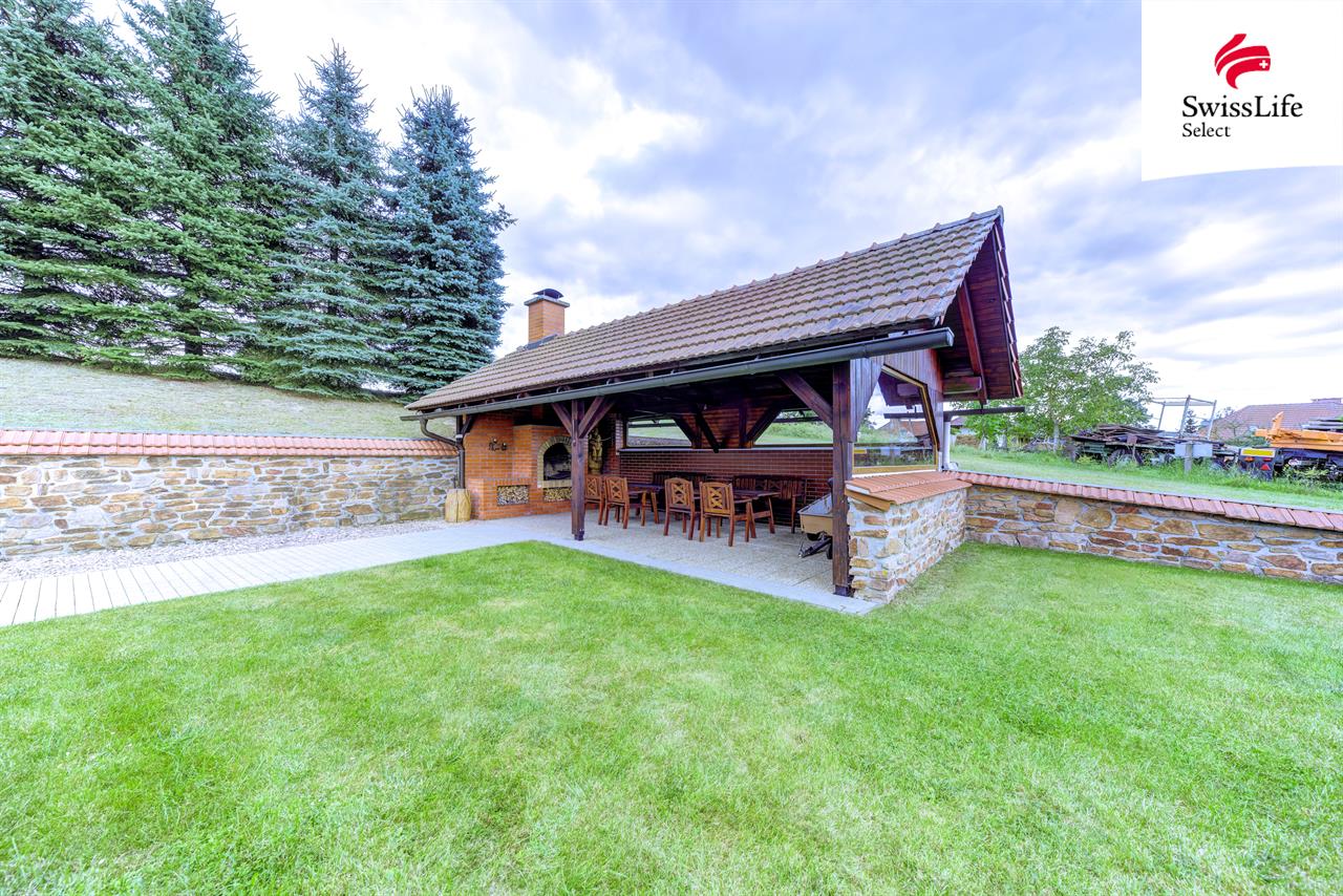 Na zahradě u domu je velká zastřešená pergola s krbem, kde budete velmi rádi relaxovat s rodinou, přáteli. A svou oblíbenou sklenku vína budete popíjet ve vinném sklípku za rodinným domem.