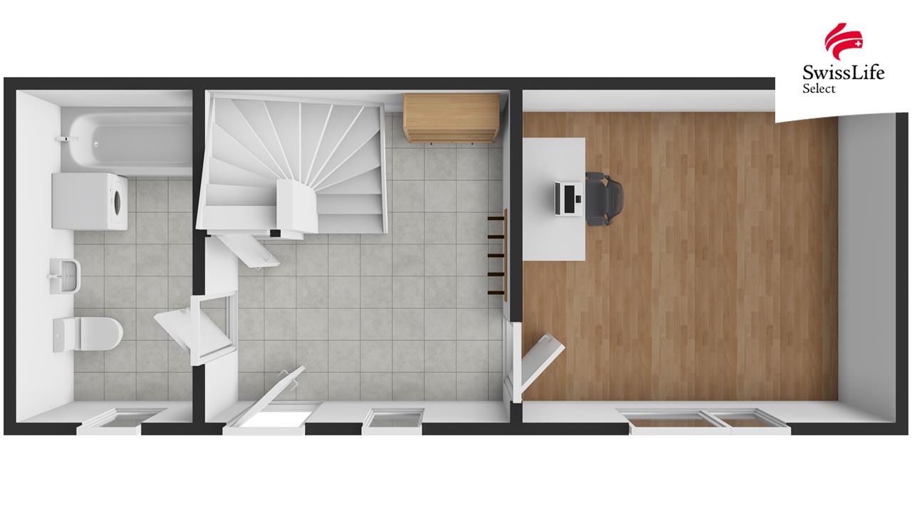 - podlahy tvoří kombinace dřevěných podlah a keramické dlažby