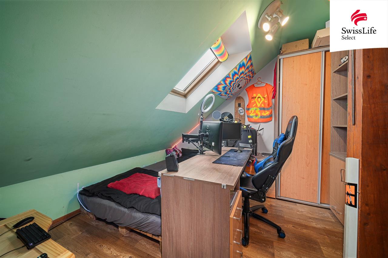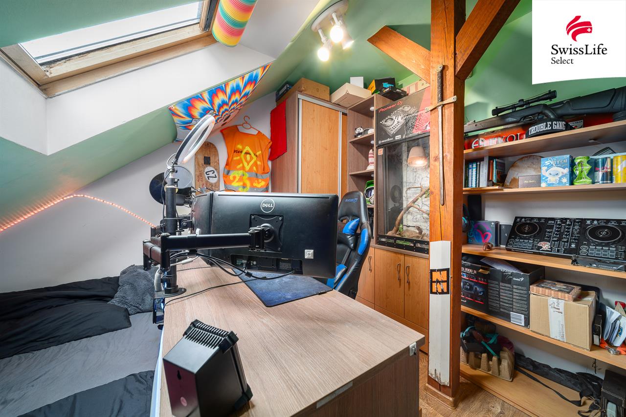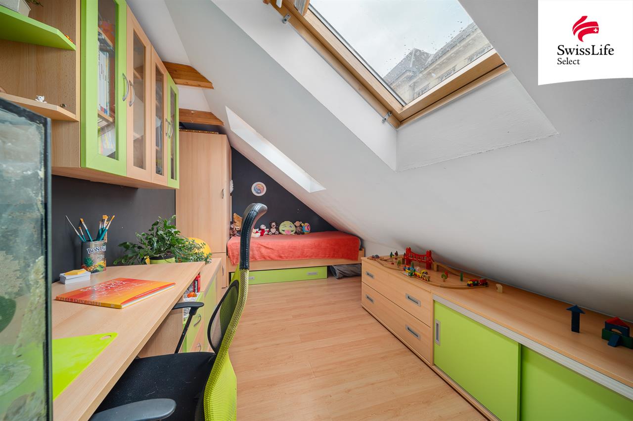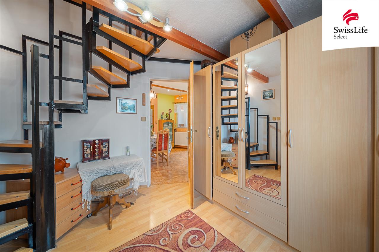V patře je umístěna prostorná bytová jednotka 4+1. Součástí dispozice je obývací pokoj, dva dětské pokoje, z nichž jeden lze rozšířit o navazující prostor nyní využívaný jako dílna, a dále mezonetová ložnice poskytující dostatek soukromí. Kuchyň s jídelnou je prakticky situována ve středu bytu a vytváří přirozené centrum společenského dění. Koupelna je doplněna o samostatné WC a technické zázemí.