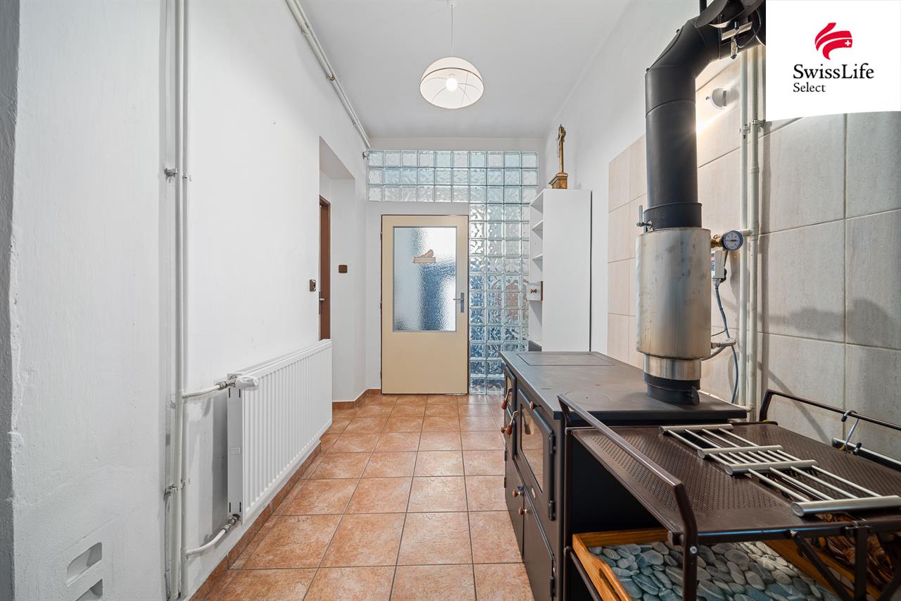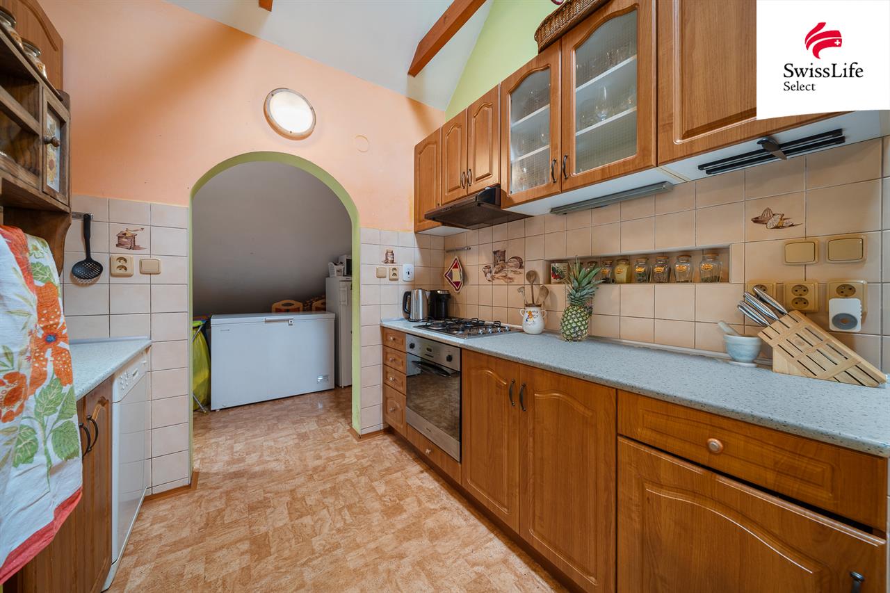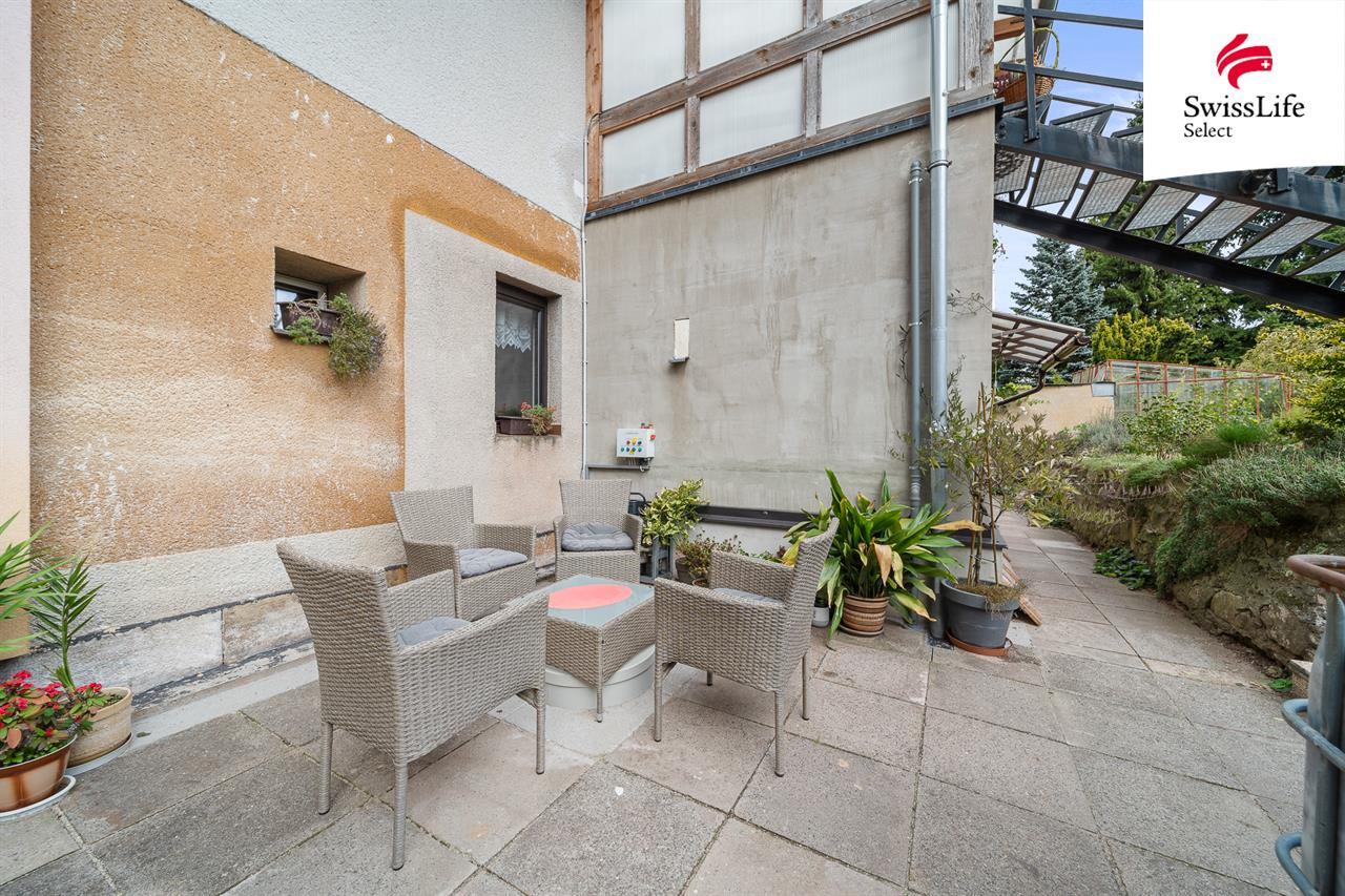 V přízemí domu se nachází samostatná bytová jednotka o dispozici 3+1 s vlastním vstupem, kterou lze využít nejen k bydlení, ale také jako kancelář, ateliér či menší provozovnu. Byt nabízí obývací pokoj, dvě ložnice, kuchyň se spíží, koupelnu a technickou místnost s přímým vstupem na zahradu, což zajišťuje komfortní propojení interiéru s venkovním prostorem.