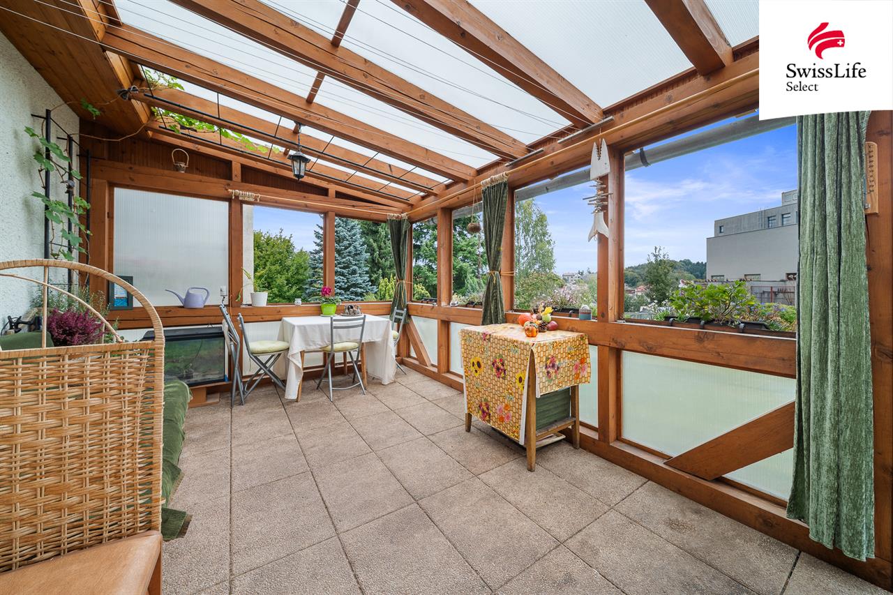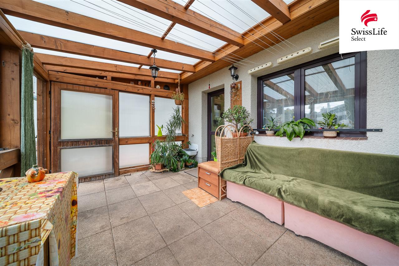 Výrazným benefitem tohoto podlaží je prostorná terasa se zimní zahradou, která je díky posuvným oknům využitelná po celý rok a zároveň slouží jako samostatný druhý vstup do domu. Terasa nabízí klidné místo pro odpočinek i posezení s rodinou a přáteli a významně rozšiřuje obytný prostor domu.