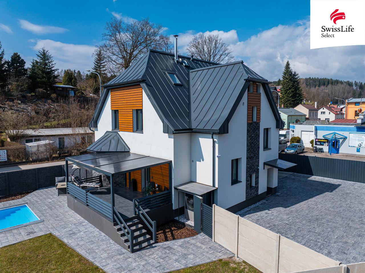 Na pozemku o výměře 764 m² najdete prostornou garáž s nabíječkou pro elektromobil. Dominantou venkovního prostoru je vyhřívaný bazén se zastřešením a navazující terasa se vstupem na zahradu, která přímo vybízí k relaxaci a pohodovému trávení času.