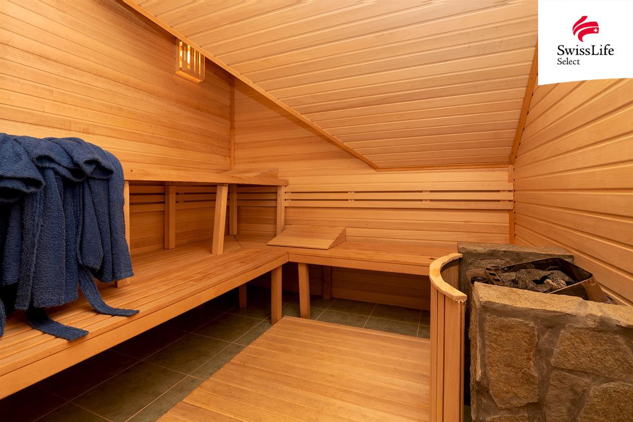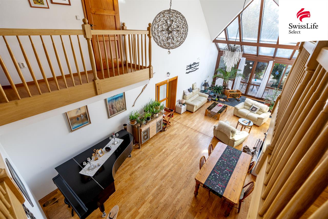 Uvnitř domu vás přivítá příjemná atmosféra, promyšlený interiér a více než dostatek přirozeného světla. Celé přízemí je kompletně bezbariérové, wheel accessibl. Dispozice navržená ing. arch. Milanem Šindlerem zahrnuje prostorný centrální obývací pokoj s částečně proskleným stropem a s francouzským oknem vedoucím na zastíněnou terasu, kuchyň se spíží, s linkou z masivu a s venkovním posezením pro dva, dále tři samostatné ložnice s koupelnami, tři pokoje (hudebna, pracovna, technická místnost) a v neposlední řadě vnitřní verandu nad obývacím pokojem proměněnou ve studovnu a čítárnu – ideální místo pro chvíle ticha, vůni knih a klidné večery. V domě se dále ještě nachází velká vstupní hala, šatna, čtvrtá koupelna (s pračkou, sprchovým koutem a toaletou) a další samostatná toaleta vedle pracovny. Co nemohu ve svém výčtu opomenout, je krásná sauna v prvním patře, vedle které je k dispozici sprchový kout. Půda domu je připravena pro vestavbu a tedy získání dalších prostorů k bydlení.