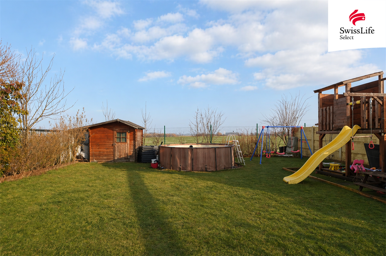 Celková plocha pozemku činí 489 m². Na pozemku se nachází zahradní domek a terasa s přímým vstupem z kuchyně, která přirozeně rozšiřuje obytný prostor do zahrady.