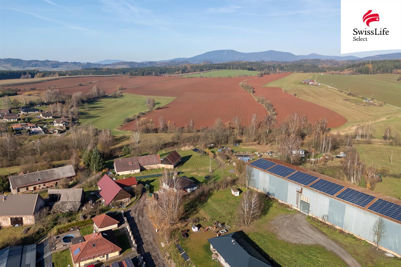 Za pozemkem se nachází zemědělská budova, nejde však o výrobní provoz. Stávající projektová studie s tím počítá a orientuje technickou část domu právě tímto směrem, čímž zachovává soukromí obytných prostor.