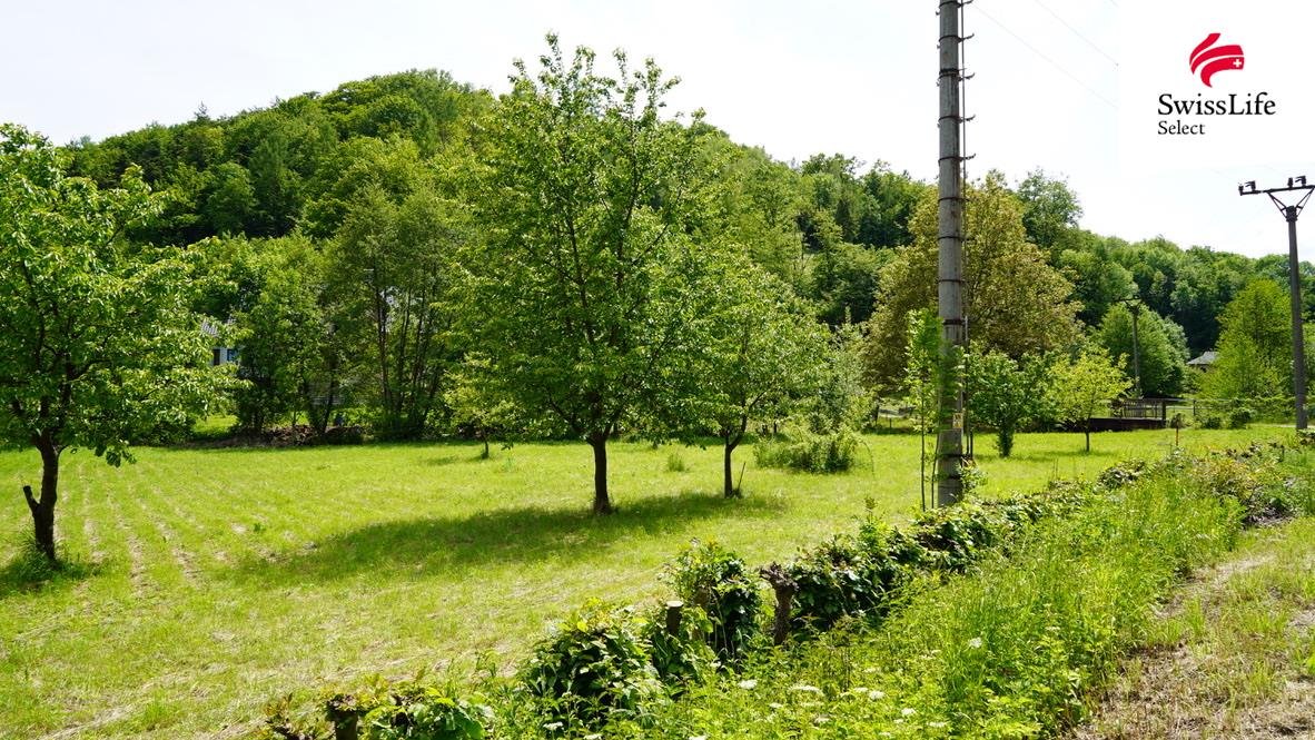 Momentálně se na části pozemku nacházejí vzrostlé ovocné stromy a z druhé strany protéká příjemný potůček.