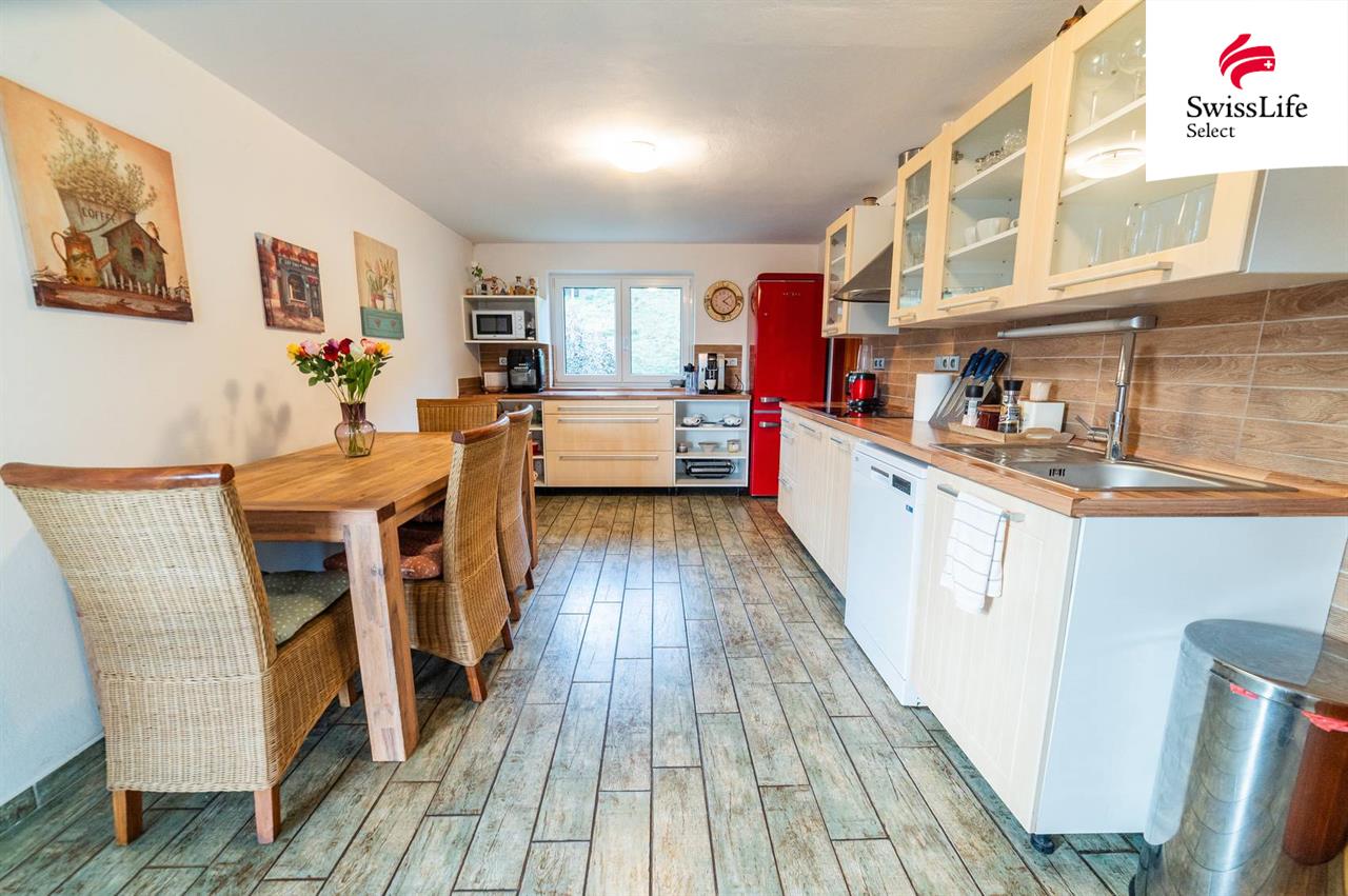 Hlavní dům (5+1): Přízemí 141 m², obyvatelná místnost v patře (25 m²), sklep a půda (70 m²) s možností vestavby. Součástí je zcela nová moderní kuchyně a nová krbová kamna na dřevo.