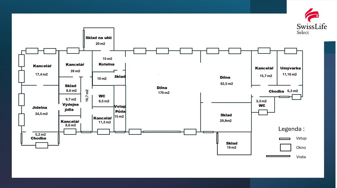 Objekt je variabilní a nabízí široké možnosti využití – od výroby přes servisní činnost až po skladové prostory s kompletním zázemím.