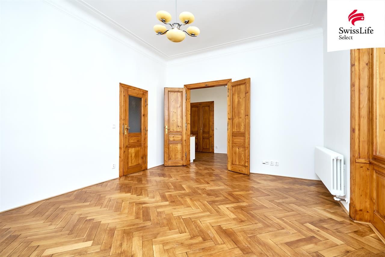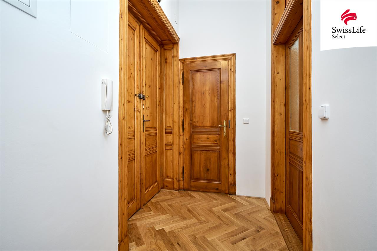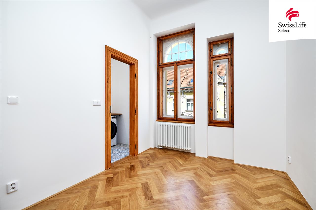 Byt o dispozici 2+1 se nachází ve čtvrtém patře klidného bytového domu s výtahem. Má užitnou plochu 59 m2 a náleží k němu i menší balkon. Disponuje velkými okny, díky nimž je celý prostor velmi příjemně prosvětlený. Byt prošel kompletní avšak citlivou rekonstrukcí, při které bylo zachováno množství původních architektonických prvků, které mu dodávají osobitou atmosféru. Byt má oddělenou koupelnu na WC a je částečně vybaven - nová kuchyňská linka, pračka kombinovaná se sušičkou. Za zmínku určitě stojí i úložné prostory v podobě dvou samostatných komor.