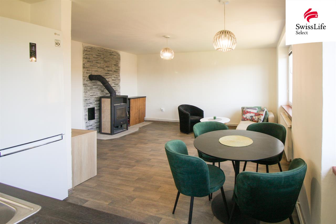 Velkou výhodou je útulný obývací pokoj kde se nachází krbová kamna s výměníkem, který nejen navodí příjemnou atmosféru, ale zároveň pomůže s vytápěním bytu.