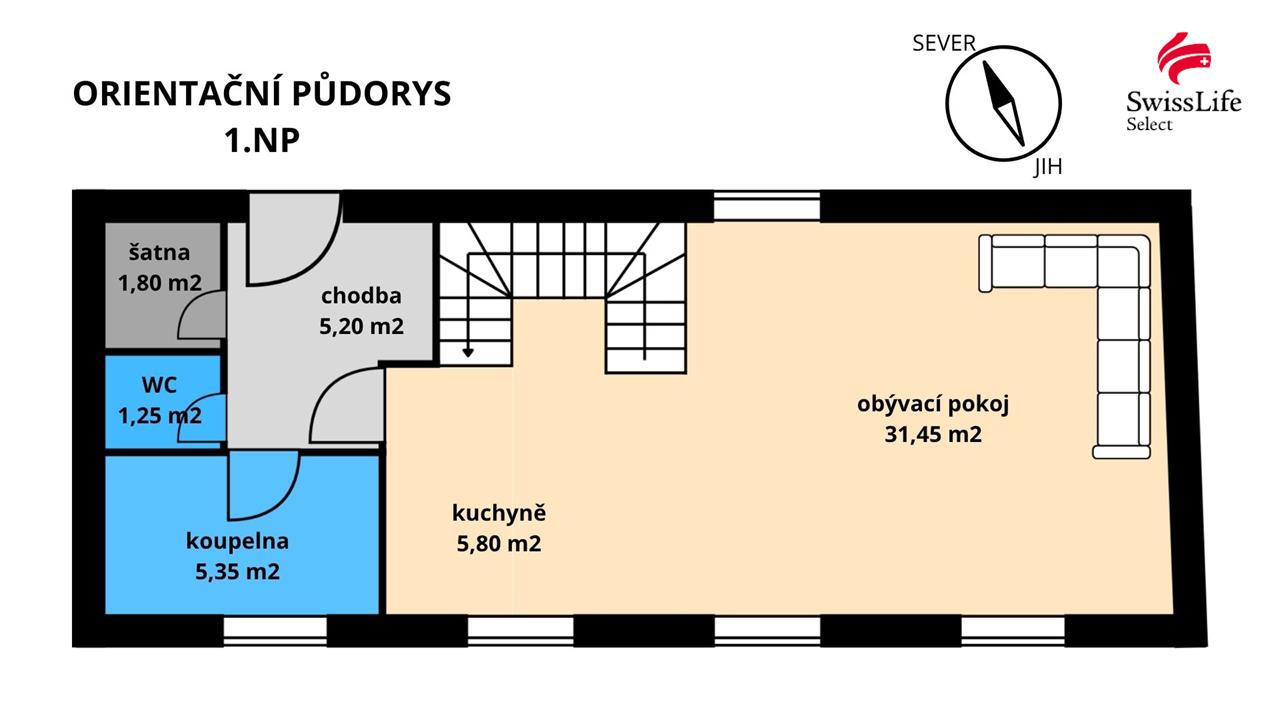 Bytová jednotka o dispozici 3+kk Vám nabídne velmi prostorný obývací pokoj s kuchyňským koutem, 2 samostatné pokoje - ložnice v patře, šatnu, koupelnu s vanou, oddělené WC, tech. místnost a chodbu. (viz. půdorys)