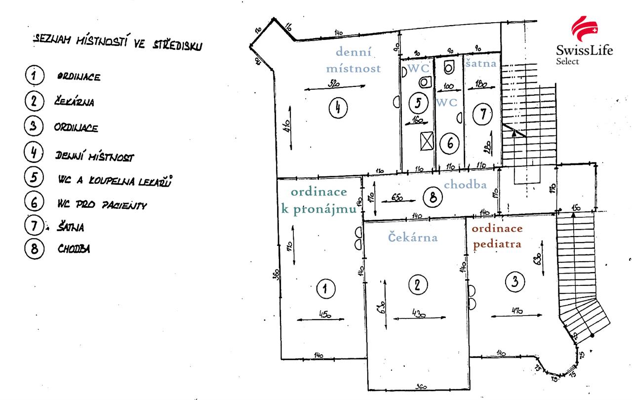 - WC pro pacienty, koupelna pro lékaře, šatna, kartotéka (3 x 4,5m2), chodba 11m2.