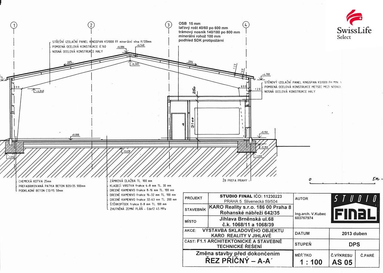 Celková plocha je 789 m², využitelná výška u stěny jsou 4 m, uprostřed 6 m - viz obrázek řezu.